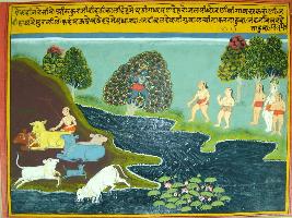 | Description / विवरण | Miniature painting based on Krishna charit depicting the story Krishna sitting on famous Kadam tree and playing flute, and on the left side a gwala sitting with cow, and on the right side Balram standing with Bal Gawal. Balram and two cow figures are incomplete. |