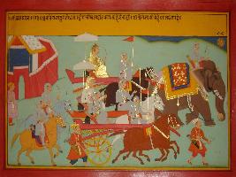 | Description / विवरण | Miniature painting based on Mahabharat - Bhishma parva depicting Duryodhan, Dronacharya and Bhishma are marching for war. |