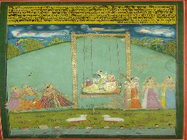 | Description / विवरण | Miniature painting based on Ragmala depicting Rag Hindol and Ragini Bilawal. It depicts Rag Hindol sitting with Ragini Bilawal on a swing and enjoying music. Three female attandants are seen with them. |