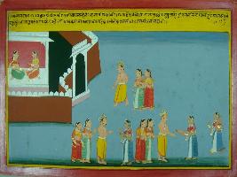| Description / विवरण | Miniature painting based on Mahabharat - Sabha parva depicting the birth story of Jarasandha. The painting depicts that the Rakshashi Jara giving the child to the king and king adopted the child by doing some ritual. |