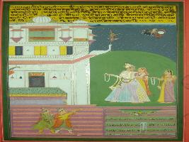 | Description / विवरण | Miniature painting based on Ragmala depicting Rag Malkosh and Ragini Gauri. It depicts Ragini Gauri is taking Rag Malkosh to the palace. A female attendant is seen with them. |