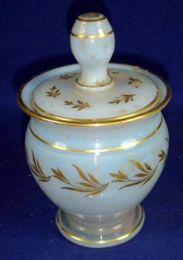 | Description / विवरण | Vase having flat circular base, bulbous body, low neck, featureless rim. and lid with knob. It is painted with golden leaf design. |