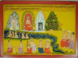 | Description / विवरण | Miniature painting based on Mahabharat - Vana parva depicting travelling to Gayavan. He is shown sitting at upper right part. At the middle part, Nilmalni river is depicted with Pandavas and Draupadi taking bath. At the upper middle part, sages shown sitting and near by Shiv temple is depicted performing yagna and king is shown of giving alms to other men. |