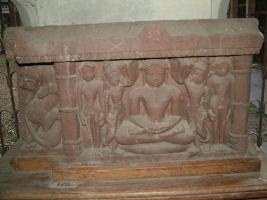 | Description / विवरण | It is a sculpture of Jain. It is shown in padmasana. Two attendant male and female are shown both side. Lion is shown on both side ege. |