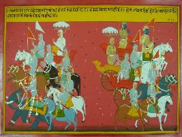 | Description / विवरण | Miniature painting based on Mahabharat - Bhishma parva depicting both Bhishma, Drona and Arjun and other Pandavas are leaving the battle filed as the day was over. |