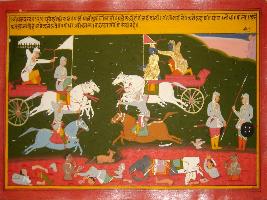 | Description / विवरण | Miniature painting based on Mahabharat - Bhishma parva. It is the depiction of war scene and a river of blood is depicted flowing, many elephants, horses, fighters are depicted lying dead, many devils are depicted eating flesh of the dead with jackals and vultures. |