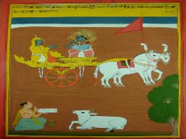 | Description / विवरण | Miniature painting based on Shri Bhagwat Gita. It depicts Krishna preaching Arjun that he is the all living beings he is the universe and there is no existence of life without him. |