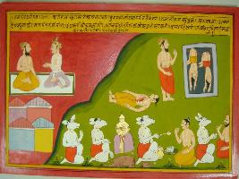 | Description / विवरण | Miniature painting based on Mahabharat - Vana parva. Yudhisthir is depicted in the ashram of Agastsya sage. Lomash rishi is depicted standing in front of two men who are punished by hanging their upside down. Demons are depicted cooking food and feeding the sages. |
