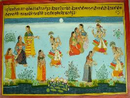 | Description / विवरण | Miniature painting based on Raghuvansha. Gopis are depicted imitating different forms of Krishna and some other gopis are watching and enjoying. |