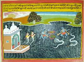 | Description / विवरण | Miniature painting based on Krishna charit depicting the story of Kaliya demon. Krishna is killing demon snake Kaliya while Nagkanyas are praying for mercy. |