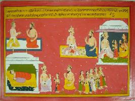 | Description / विवरण | Miniature painting based on Mahabharat - Vana parva. Yudhisthir is depicted with Vashishth. A king is depicted with two women and two women are depicting sleeping on the lower part. A king, queen and a sage are depicted with many female attendants. |
