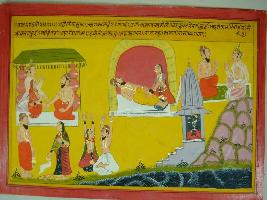 | Description / विवरण | Miniature painting based on Mahabharat - Vana parva. A temple of Vishnu is depicted. A sage is depicted talking to a king . Wife of sage is massaging his legs. A sage is depicted performing marriage of a king. |