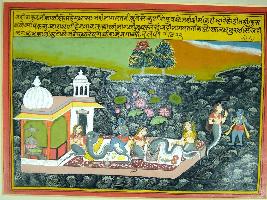 | Description / विवरण | Miniature painting based on Krishna charit depicting the story of Kaliya demon. Krishna arrives at the palace of Kaliya under the river and asks him for fight. |