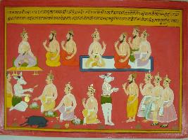 | Description / विवरण | Miniature painting based on Mahabharat - Vana parva. On the upper part king is depicted with sages and on the lower part boar headed man is depicted feeding three kings. |