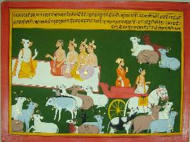 | Description / विवरण | Miniature painting based on Mahabharat - Vana parva. Three kings with a sage are depicted sitting with boar headed figure. Many cows are depicted. |