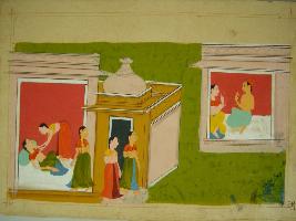 | Description / विवरण | Miniature painting depicting Nayika after her sleep going to meet Nayaka with her friend. At the left side Nayaka and Nayika are in conversation. This painting is incomplete. |