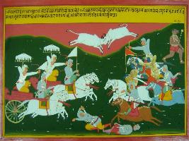 | Description / विवरण | Miniature painting based on Mahabharat - Bhishma parva depicting fight between Bhishma and Arjun. Arjun twice cut the string of the bow of Bhishma and Bhishma wounded Krishna. |