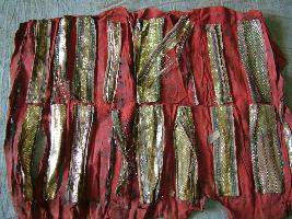 | Description / विवरण | These 18 small laces are together stitched to red cotton cloth, done with zari work in gold and silver pattern with black borders. All are of different sizes. |
