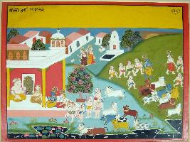 | Description / विवरण | Miniature painting based on Krishna charit depicting scene of life in Mathura. Krishna is sitting with Balram in front of Nanda and Yashoda. Gopas and Krishna, in other part of painting depicting herding the cows. |