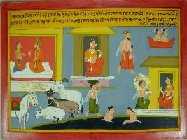 | Description / विवरण | Miniature painting based on Mahabharat - Vana parva. It is a village scene, Rishi Agastsya is depicted and two horses and three cows are also depicted and two people are depicted bathing in a river. |