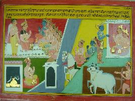 | Description / विवरण | Miniature painting based on Mahabharat - Sabha parva depicting other Pandavas and Yudhisthir are ruling the territory according to Dharma. It also depicts Krishna is offering some wealth to Yudhisthir. |