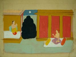 | Description / विवरण | Miniature painting depicting Nayak sitting in front of his house at left part. Nayika is shown sitting inside the palace at right part. It is an incomplete painting. |