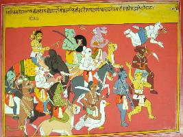 | Description / विवरण | Miniature painting based on Harivansha depicting the Rakshasa army, sitting on various animals, marching against the Devtas. |