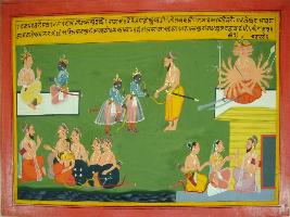 | Description / विवरण | Miniature painting based on Mahabharat - Vana parva. Pandavas depicted with Agastsya rishi and he is telling them that Ram took birth in the house of Dashrath to kill the demon Ravan. |
