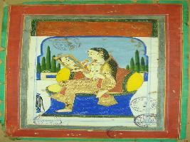 | Description / विवरण | Miniature painting depicting Nayika, facing right sitting on couch inside a palace, holding a mirror in one hand and looking herself in it and carrying something round in shape in her other hand and using it for make up. She is sitting with her one leg folded and other one hanging. |