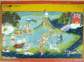 | Description / विवरण | Miniature painting based on Krishna charitra depicting that Krishna Balram and other boys doing cow herding in Vrindavan. While Balram is killing Batrasura. Some boys are climbing on the tree for eating fruits. |