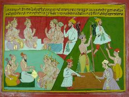 | Description / विवरण | Miniature painting based on Mahabharat - Sabha parva depicting VedaVyas, Yagnavalkya ather Brahman kings performing the yagna of Yudhisthir. |