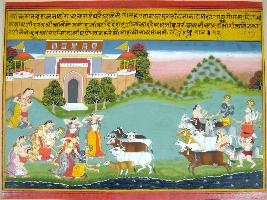 | Description / विवरण | Miniature painting based on Krishna avatar charit depicting the scene of Gokul where mothers are receiving their baby along with the other body coming from cow herding. |