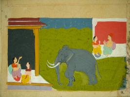 | Description / विवरण | An incomplete miniature painting of a Nayika sitting with her friend under a roof and an elephant is standing in front of them. It is an incomplete painting. |