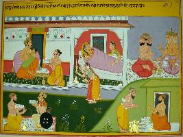 | Description / विवरण | Miniature painting based on Raghuvansha depicting a rishi giving blessing to the king for having a child in the bottom. On top king paying homage to the Rishi. Queen has been shown with a child. In left top five-headed Brahma talking to five headed Kartikeya. |