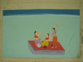| Description / विवरण | An incomplete miniature painting depicting Nayika with her two friends, sitting on a cushion. The friends probably help the Nayika in her shringar. |