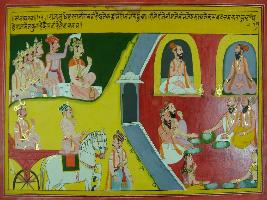 | Description / विवरण | Miniature painting based on Mahabharat - Sabha parva depicting Yudhisthir and other Pandavas are feeing the Brahmans and gained blessing from them. |
