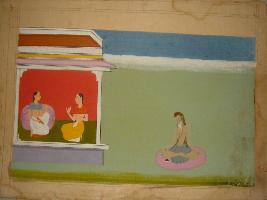| Description / विवरण | Miniature painting depicting Nayika talking to her friend in palatial balcony and a yogi is sitting outside. It is an incomplete painting. |