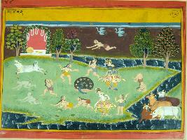 | Description / विवरण | Miniature painting based on Krishna charitra depicting a seen of Vrindavan where gopas are playing, some cows are drinking water in the river Yamuna. Balram also seen in dancing position while Krishna is playing flute. |