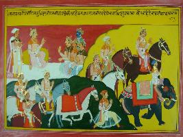 | Description / विवरण | Miniature painting based on Mahabharat - Sabha parva depicting the finishing of a yagna. Dhristadyumana goes to see off Virat and Bhim goes with Kauravas to see off them. |