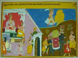 | Description / विवरण | Miniature painting based on Raghuvansha. On the left side there is depiction of king seated on throne talking to a sage and sage blessing the king, on the right side is the depiction of one man hitting a rock with a sword and two people taking camel and two horses and a sage walking in front of them. |