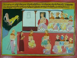 | Description / विवरण | Miniature painting based on Mahabharat - Sabha parva depicting that Karna telling Dusasana to take Draupadi to home. Hearing which Draupati says that all Pandavas are eunach and cannot save her. Then Bhim says that he will kill Dusasana and suck his blood. |