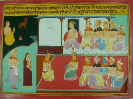 | Description / विवरण | Miniature painting based on Mahabharat - Sabha parva depicting hearing Bhim, Karna asks Duryodhan to listen to him and says women are servents. Then Duryodhan shows his thigh by seing which Bhim promised to kill him by breaking his thighs. |