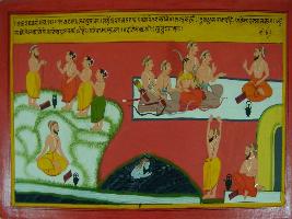 | Description / विवरण | Miniature painting based on Mahabharat - Vana parva depicting Pandavas with a rishi and he is telling them story of Parasurama. On other side Parasurama is depicted with Indra. On the lower part he is depicted doing hard penance and taking bath at a pond. |