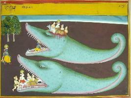 | Description / विवरण | Miniature painting based on Krishna avatar charit depicting on the lower part Aghasura a demon swallowing all the gopas and Balram. The upper part depicted Krishna killed Aghasura and rescued the gopas and Balram. |