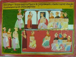 | Description / विवरण | Miniature painting based on Mahabharat - Sabha parva depicting Dhritrashtra, Gandhari and Bhishma come to the cout and ask Draupadi to seek boon. |