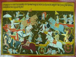 | Description / विवरण | Miniature painting based on Mahabharat - Bhishma parva depicting Abhimanyu and Satyaki are fighting with Shakuni and Arjun fighting with Kaurava army. |