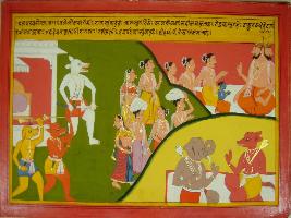 | Description / विवरण | Miniature painting based on Mahabharat - Vana parva depicting Lomash sage telling Yudhisthir that in satyug there was a demon named Kalkeya who defeated gods and took over heaven. Defeated gods approached Brahma and Brahma told Indra to go to hermitage of sage Dadhichi. |