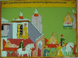 | Description / विवरण | Miniature painting based on Raghuvansha depicting Lord Kubera. working on the kings palace. below it king sleeping in the Chariot. It shows wealth of the king. |