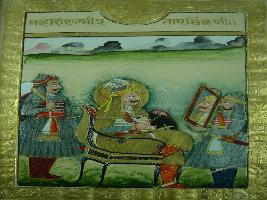 | Description / विवरण | Miniature painting depicting Maharana Pratap Singh sitting on a throne and flanked by a male chauri bearer while another follower is holding a mirror in front of him. |