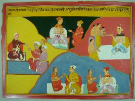| Description / विवरण | Miniature painting based on Mahabharat - Sabha parva depicting is givings alms to people and Brahmans. Two couples is depicted sitting on lower part. |